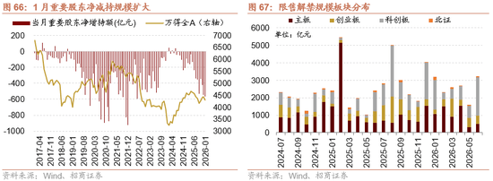 1月主要股东增持69亿元,减持638亿元,净减持570亿元,净减持规模较2025年12月前值547亿元有所回升。按照截至2026年1月31日收盘价估算,2026年2月解禁规模为2309亿元,解禁规模较2026年1月前值3190亿元有所缩小,分歧板块解禁规模来看,从板1505亿元、创业板418亿元、科创板363亿元、北证22亿元。考虑到2026年2月解禁规模有所回落,2026年2月主要股东二级市场净减持规模无望连结平稳。