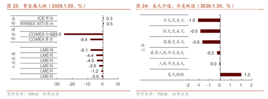 但现实的环境是,特朗普最终选择了沃什,其政策从意明显没有那么,且强调“厘清货泉政策取财务政策的本能机能鸿沟”,缓解了市场对美联储性的担心,而且中持久来有益于提振美元,所以前期的叙事逻辑短期面对批改。因而从沃什被特朗普提名为美联储新的概率飙升起头,全球本钱市场就呈现巨震,美元指数走高,股票和商品大跌,特别贵金属暴跌,此中comex黄金从高点最大回撤跨越16%;comex白银从高点最大回撤跨越39%,相对应的,股票市场的金属板块沉挫。汇率方面,人平易近币汇率相对比力不变,贬值幅度较小。取此同时,原油价钱反而正在继续暖和上涨。次要是伊朗场面地步严重推升油价。近期特朗普向伊朗发出军事,伊朗颁布发表将于2月1日至2日正在霍尔木兹海峡举行军事演习,演习内容包罗实弹射击,美伊冲突将霍尔木兹海峡航运,对油价构成支持。