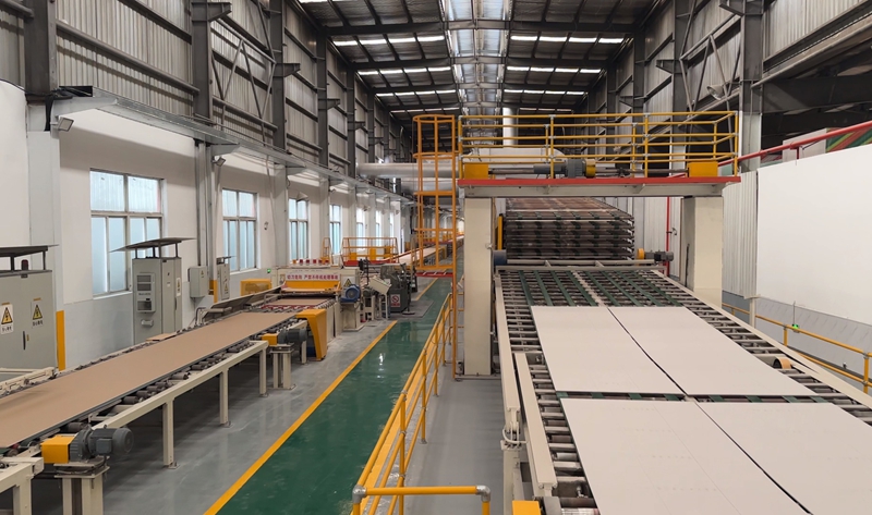 走进贵州皇冠新型建材无限公司出产车间,成堆的纸面石膏板划一码放,叉车往来穿越,流水线上的工人各司其职。