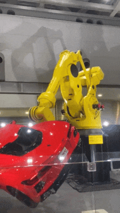 再来说另一位大牌:川崎沉工。它也拿汽车当“道具”,秀出了一辆整车是若何被良多只机械臂扑上来加工的。