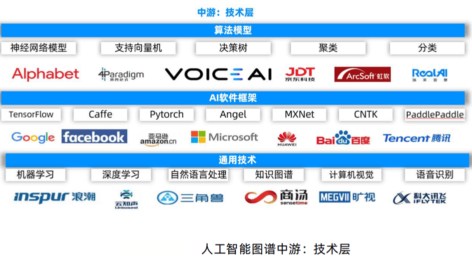 手艺层是AI财产成长的焦点,包罗通用手艺、AI手艺框架以及算法模子等。这一层级依托于海量数据的挖掘处置取机械进修建模,来进行各类使用手艺的开辟,从而处理实践中的具体类别问题。计较机视觉、天然言语处置、语音识别、机械进修、深度进修、学问图谱为这一层级的代表性手艺。劣势企业如谷歌、亚马逊、Facebook加速摆设机械进修、深度进修底层平台,成立财产现实尺度。